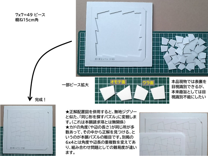 具体的な実施例として、手作り工作にて、6x4=24ピース(片面に大判絵柄)と7x7=49ピース(両面無地)の「四角形ジグソーパズル」を制作済です。ピース形状が裏返しも含めすべて異なっていて、外枠内をきれいに埋められる配置は既知分は1通りだけです。ただし四角形の角度や辺長の一部が同じピースが基本的に複数あり、「正解の組み合わせを探す」パズルとなっています。つまり、「ピース1:1嵌合を探す」という「普通のジグソーパズル」とはそもそも難易度の因子が根本的に異なります。