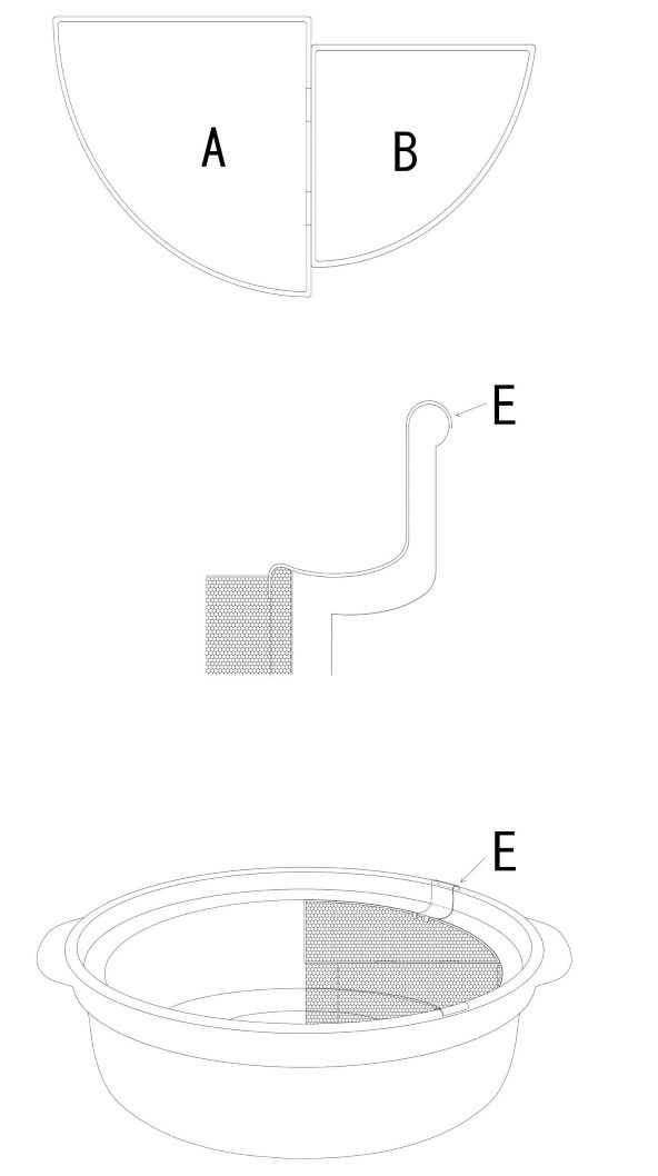 鍋の形状にフィットした二等辺三角形状の仕切りかごを鍋に直接セットでき、大きさの違う2種類で並列、重ねの両方で使用出来る。